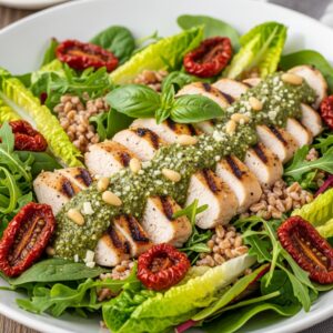 Salada de Frango Grelhado, Pesto e Tomate Seco com Farro