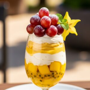 Parfait Tropical Dourado com Creme Aveludado e Uvas Rubras