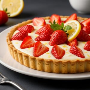 Uma torta refrescante e vibrante que combina a acidez do limão com a doçura suculenta dos morangos, sobre uma base crocante e um recheio cremoso.