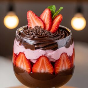 Uma combinação sublime e irresistível de uma trufa cremosa de chocolate meio amargo, intercalada com camadas de morangos frescos e um toque crocante de biscoito,