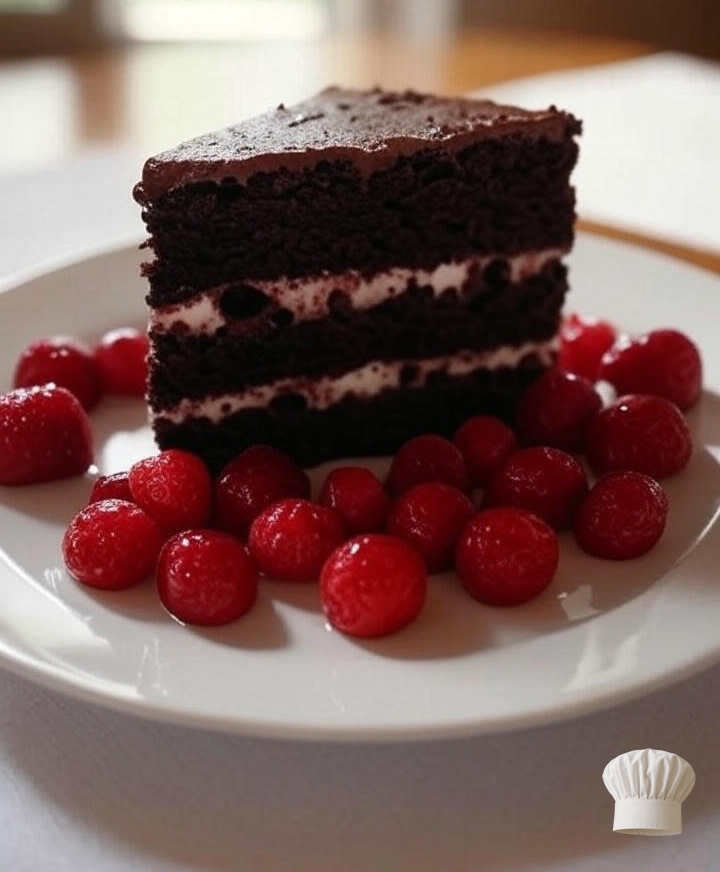 Esta receita resulta em um bolo de massa escura, rica e muito úmida, graças ao iogurte e ao café quente que realça o sabor do cacau. As frutas vermelhas adicionam um toque de acidez e frescor que equilibra perfeitamente o doce do chocolate.