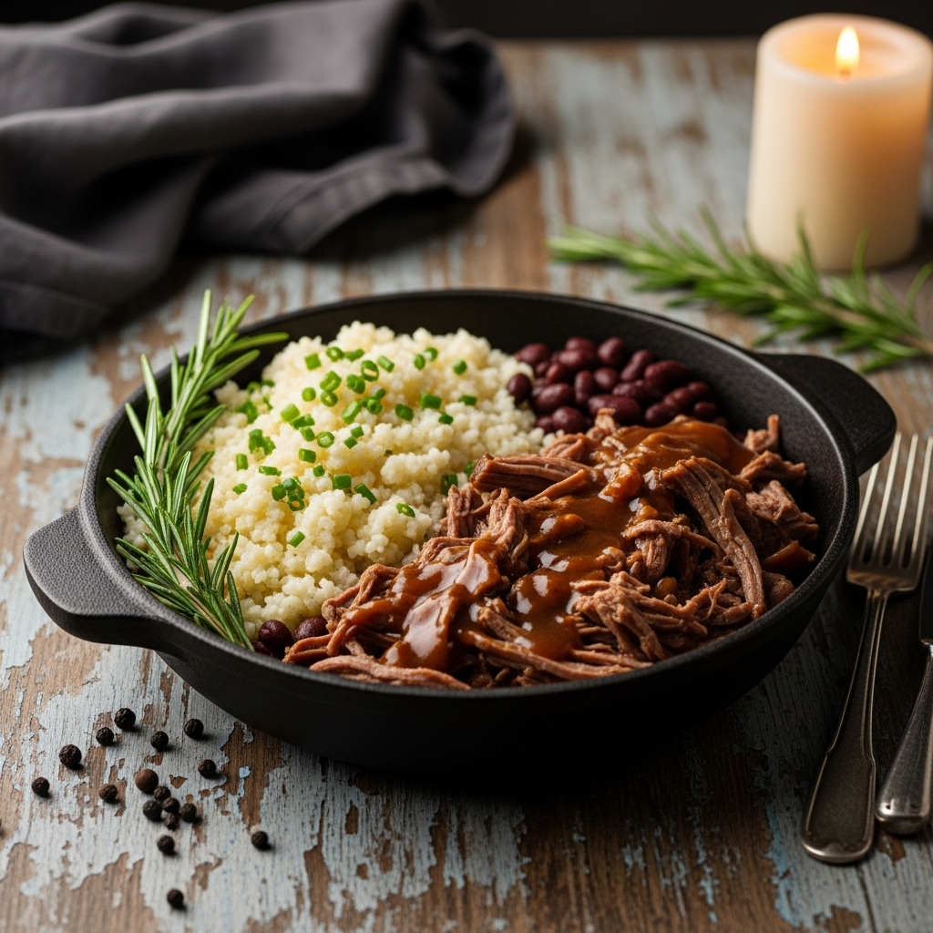 Sirva a Carne de Panela desfiada ou em cubos sobre o ‘Arroz’ de Couve-Flor Cremoso, acompanhada generosamente do ‘Falso Feijão’ Umami. Desfrute!