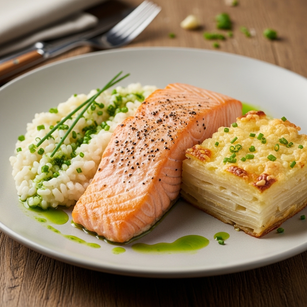 - Em cada prato, coloque uma porção generosa do “Risoto” Cremoso de Couve-Flor. Ao lado, disponha uma porção do Gratin de Nabo Aromático. Finalmente, coloque a posta de Salmão Supremo sobre ou ao lado do “risoto”. Sirva imediatamente, desfrutando de uma refeição gourmet, saudável e deliciosa!
