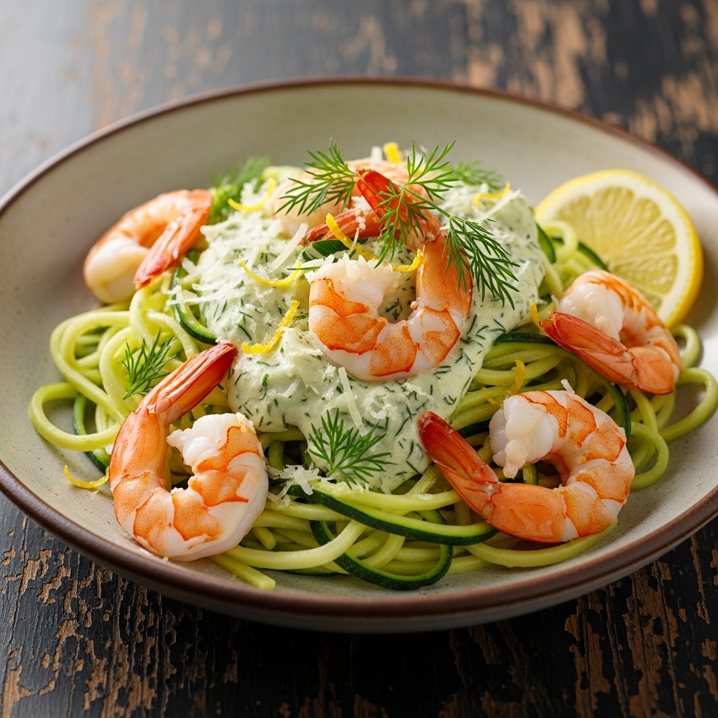 - Adicione o macarrão Shirataki drenado e as fitas de abobrinha frescas à frigideira com o molho cremoso. Misture delicadamente, aquecendo por 2-3 minutos até que as fitas de abobrinha amoleçam ligeiramente e o molho envolva bem o macarrão. Incorpore o camarão reservado e as folhas de manjericão picadas. Misture brevemente para aquecer tudo.