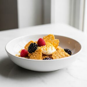 Uma sobremesa elegante e surpreendentemente leve, onde a acidez vibrante das frutas silvestres encontra a suavidade de um creme de limão e a crocância de