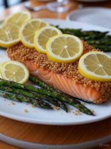 Salmão com Crosta Crocante acompanhado de Aspargos